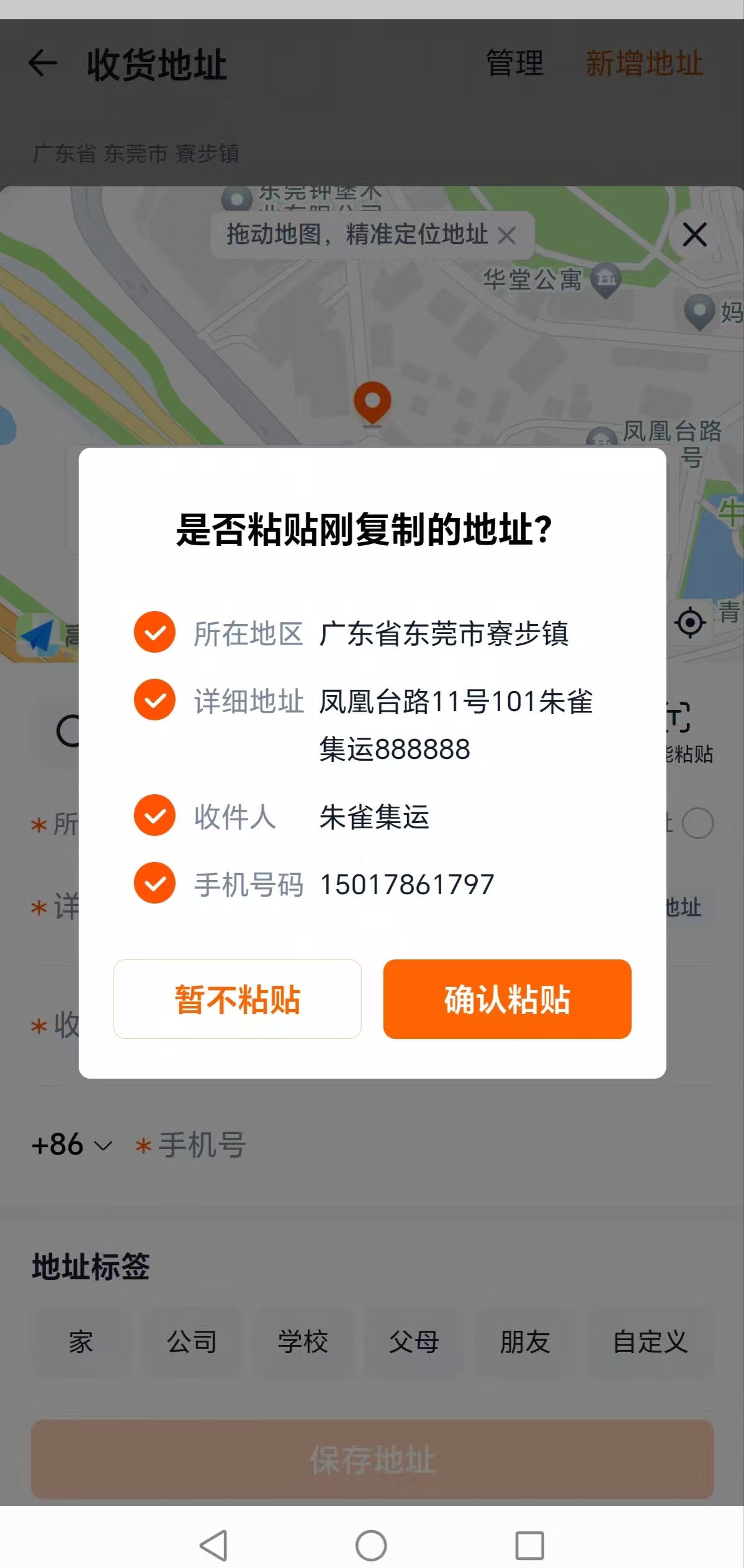 一键复制地址到电商购物平台保存为收货地址,或者顺丰、京东、货拉拉、跨越物流等快递及大件物流公司平台为下单收件地址。以淘宝平台为例:确认粘贴并保存地址,下单时收货地址选择该地址