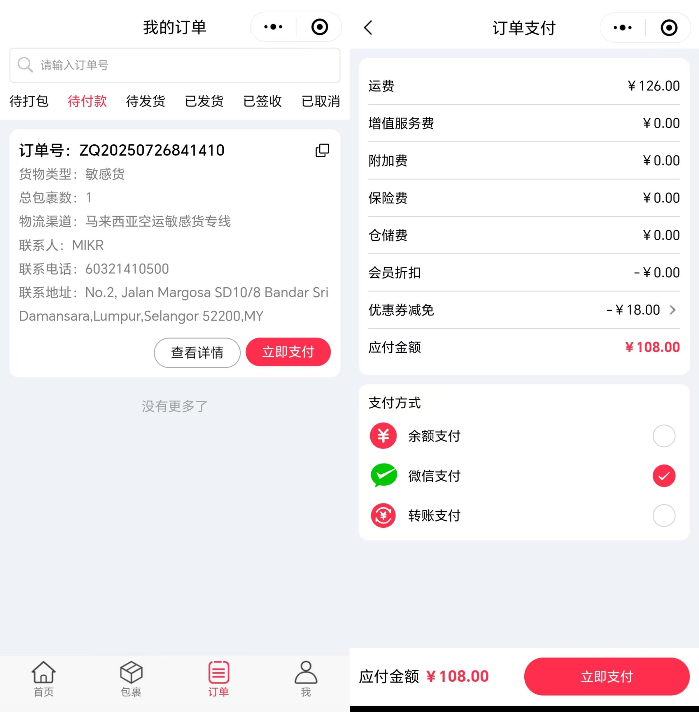 用户提交申请集运下单后,仓库下架打包称重测量,系统进行计费,用户收到付款通知后,进行付款即可